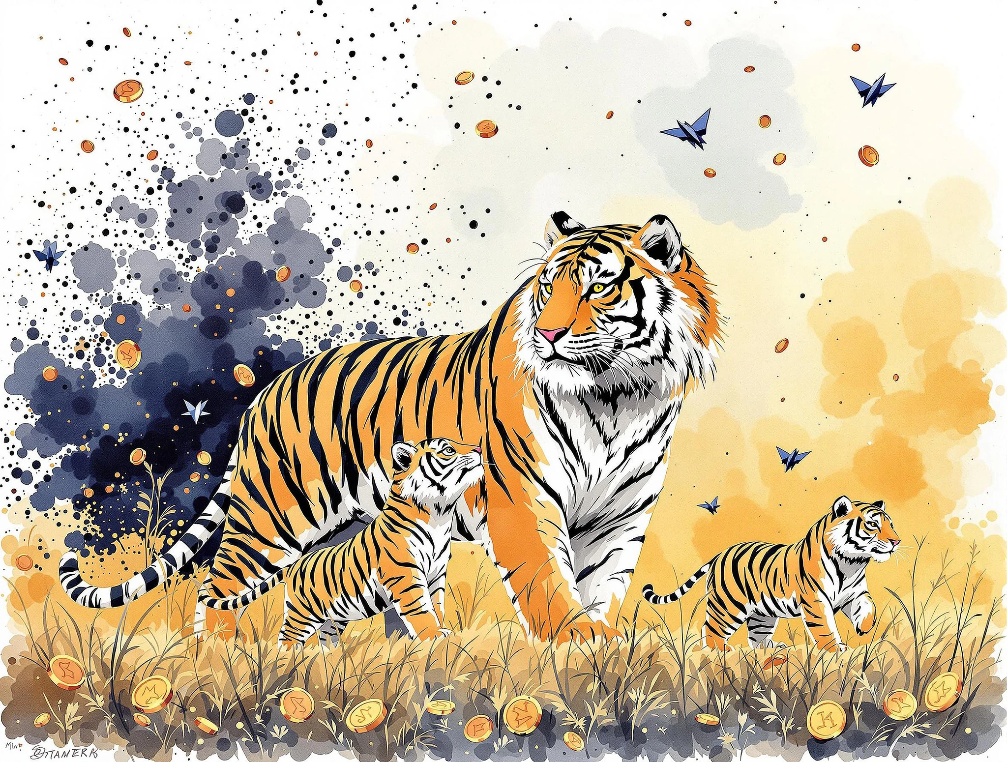 A big tiger and two small tigers, behind the big tiger there is a gradient of big mouse phantom, the king mouse controls the tigers, watercolor style, featuring splashes of ink and an ink wash style, with splattered ink dots, scattered copper coins and gold beans in the background, paper airplanes in the background, ink splashes above, rich in details, the tiger is the main subject, ink swirling around its body, in an ink wash style,masterpiece, best quality, original, wallpaper, colorful, covr, everyone, gradient_background, huge_filesize, highres, traditional_media, fine_art_parody, head tilt, ink style,watercolor, masterpiece, best quality, in a meadow, walking, Stay to the right,