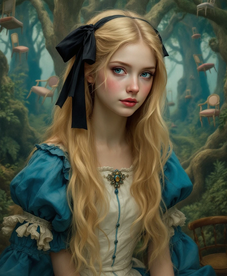 Renascimento (Estilo de Leonardo da Vinci) "A highly detailed Renaissance painting of Alice from Alice in Wonderland, featuring long blonde hair, wearing a classic blue dress with white accents and a black ribbon in her hair. She is depicted in a surreal, whimsical forest with floating objects like chairs, rendered with realistic details, vibrant colors, soft chiaroscuro lighting, and geometric perspective. The background includes ethereal, dreamlike elements, in the style of Leonardo da Vinci, 4k resolution, intricate textures, and a magical atmosphere. "