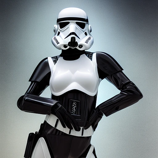 female dressed as storm trooper, lingerie, starship background, (((full body visible) )), looking at viewer, portrait, photography, detailed skin, realistic, photo-realistic, 8k, highly detailed, full length frame, High detail RAW color art, piercing, diffused soft lighting, shallow depth of field, sharp focus, hyperrealism, cinematic lighting.