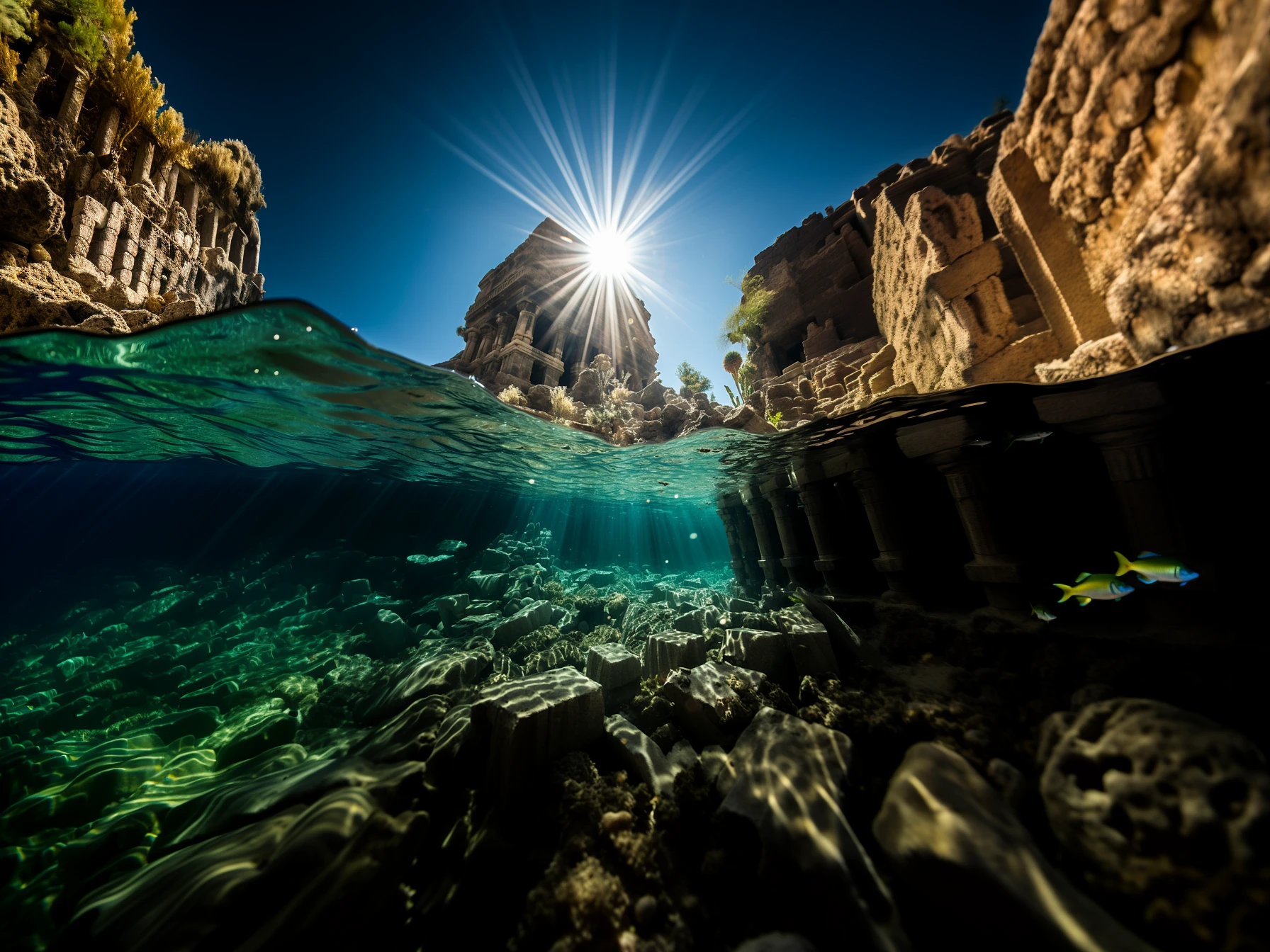 color photo of an ancient temple discovered deep underwater, part of the lost city of Atlantis. The temple is still intact, with ornate columns and intricate carvings. The water is crystal clear, revealing schools of brightly colored fish swimming around the temple. The photo was taken using an underwater camera with a fisheye lens, capturing the majesty and mystery of the underwater ruins. The colors are cool and muted, with the sun filtering through the water above. Cinematographers: James Cameron, Jacques Cousteau, Wes Ball, Al Giddings, and Jean-Michel Cousteau