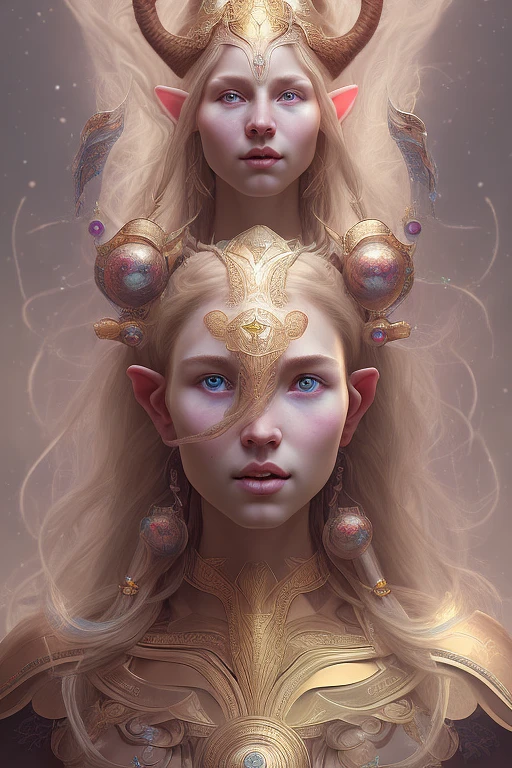 Facial portrait of the celestial goddess, centered portrait, elf long hair, (blonde: 2.5) complex details, high detail, full body shot, (epic armor) , smooth, clear focus! Conceptual art was created by Ruan Jia, Ilya Kufshinov, Alphons Mucha, and Rosdrus.