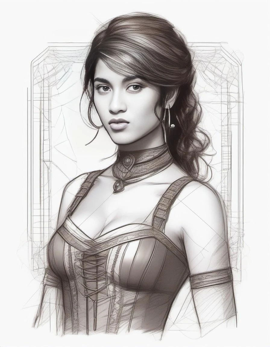 Sketchbook Style, Sketch book, hand drawn, dark, gritty, realistic sketch, Rough sketch, mix of bold dark lines and loose lines, bold lines, on paper, turnaround character sheet, a stunningly beautiful Amazon Woman, slim body, leather and lace corset, brown red floating hair, bangs, Full body, arcane symbols, runes, dark theme, Perfect composition golden ratio, masterpiece, best quality, 4k, sharp focus. Better hand, perfect anatomy. by With Design In Mind