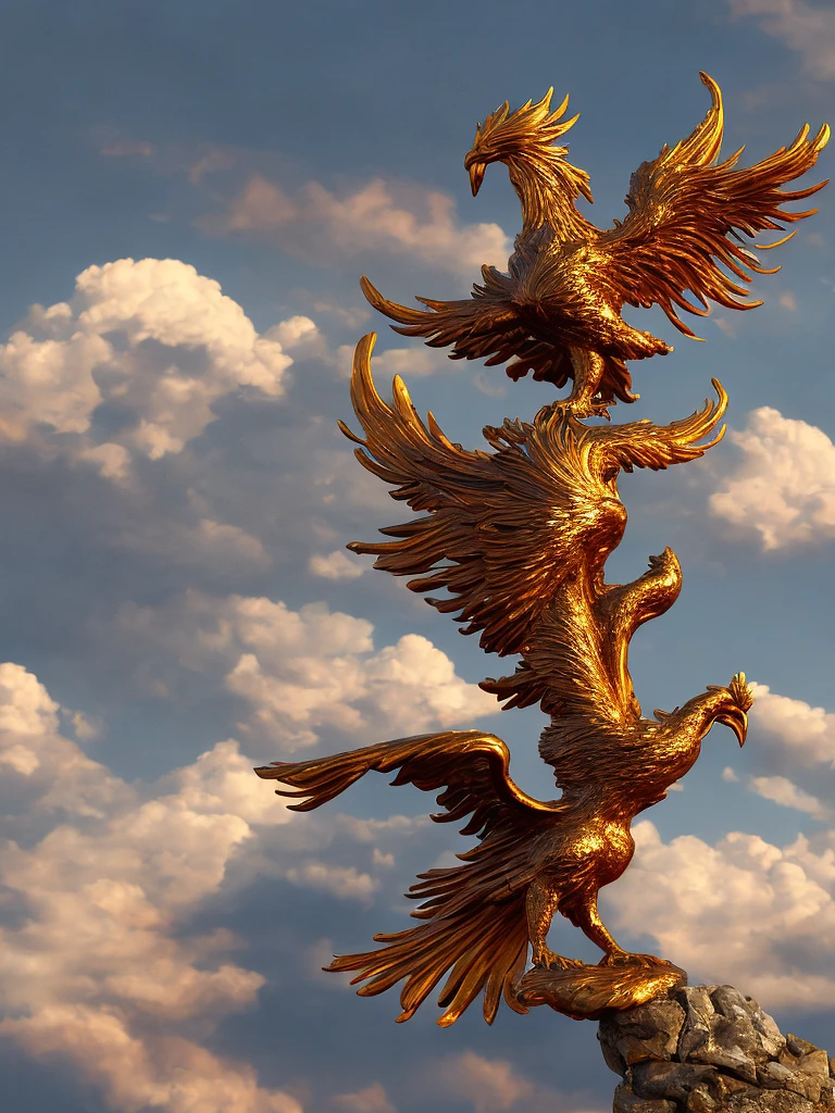 A majestic phoenix with vibrant plumage, its fiery wings spread wide, golden feathers illuminating against a dark sky, perched atop a rugged mountain peak, surrounded by swirling clouds, capturing the phoenix's grace and intensity, Sculpture, bronze casting, 8k high definition --ar 1:1 --v 5