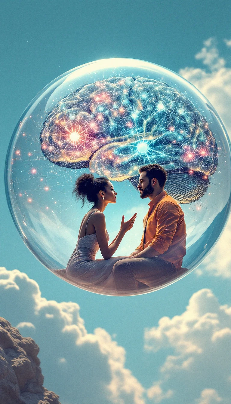 A stunning beautiful woman and a strong man inside a giant hovering glass sphere, sharing thoughts. Background within the spere is a brain that got overloaded with a neuronal network. Backround outside the sphere is a blue calm sky with some soft white clouds and angles