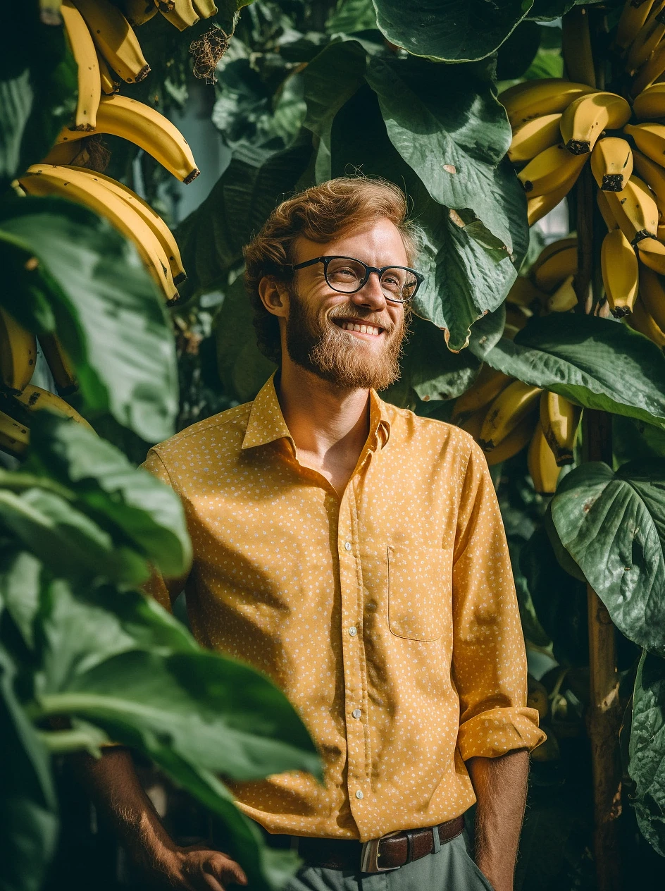 man with a shirt and bananas while smiling in front of a tropical plant, in the style of ray tracing, the helsinki school, webcam photography, sparse, angular linework, daniela uhlig, elegantly formal, smooth and shiny --ar 119:160 --q 2 --s 750 --style raw --v 5. 1