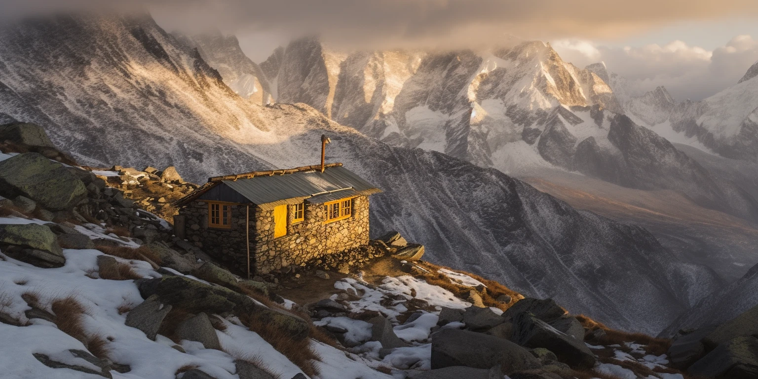 Sturdy cabin on Everest, symbolizing human strength and solitude amidst nature's overwhelming grandeur