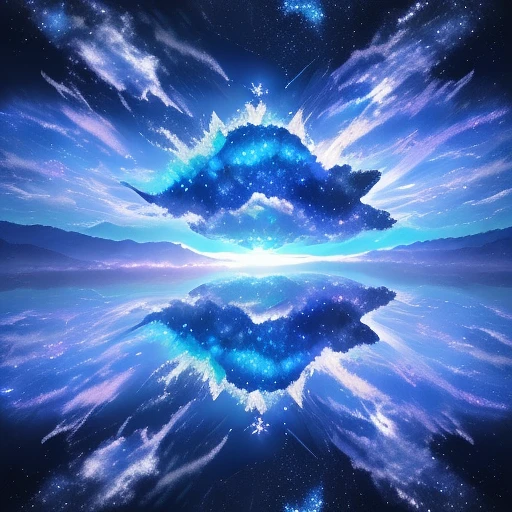 Beautiful prismatic-plasma lake blue crystal, mounteins epic, extreme detail, 4k, ultra hd, hyper detailed, colorful, sparkle covered sky, masterpiece 3D science fiction art. Bright blue skys, clouds brigth white. sun white brigth. day. Sun.