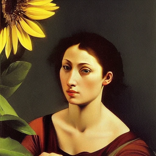 a painting of a beautiful female by Caravaggio, sun flowers in background, oil painting, with palette knife, --ar 3:2 --c 15 --s 5