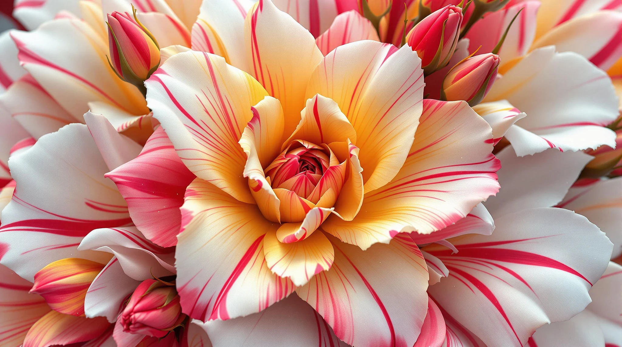 an abstract hybrid 3d fictive flowers and buds, close up in a kaleidoscope of colors, rose x camelia, the flowers are in a large streaks of varigated, gradiation , of white, ruby red and yellow tones, the composition of the colors should evoke a sense of passion for valentine day , uhd 8k
