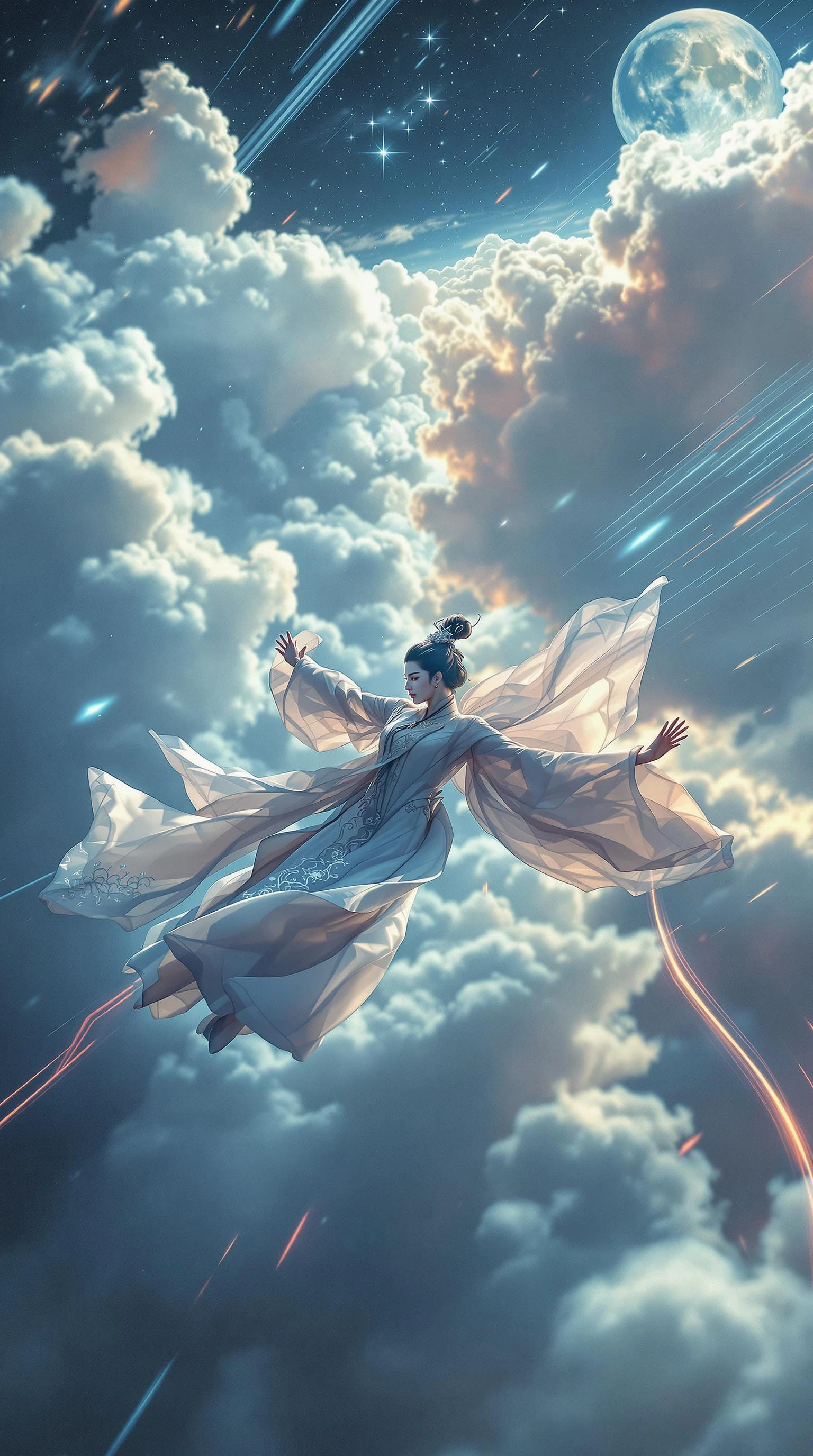 A rapid aerial tracking shot from the drone's perspective captures a surreal dream sequence of an ancient Chinese beauty dressed in an exquisite Hanfu, flying at high speed in a prone position. She effortlessly glides through the clouds, her body fully extended with arms outstretched to the sides, legs slightly parted, and her head forward, capturing the sensation of smooth horizontal flight. Her Hanfu billows in the wind as the camera closely tracks from a slightly higher angle, moving from the left rear to the right rear, maintaining a continuous view of the prone position as the character swiftly traverses the scene. The environment is dynamic and rapidly changing, with clouds below and white clouds streaking by in the background, a large moon hanging high in the distance, and a sparkling night sky surrounding, with motion blur and light trails enhancing the sense of speed and fluidity. Rapid movement.