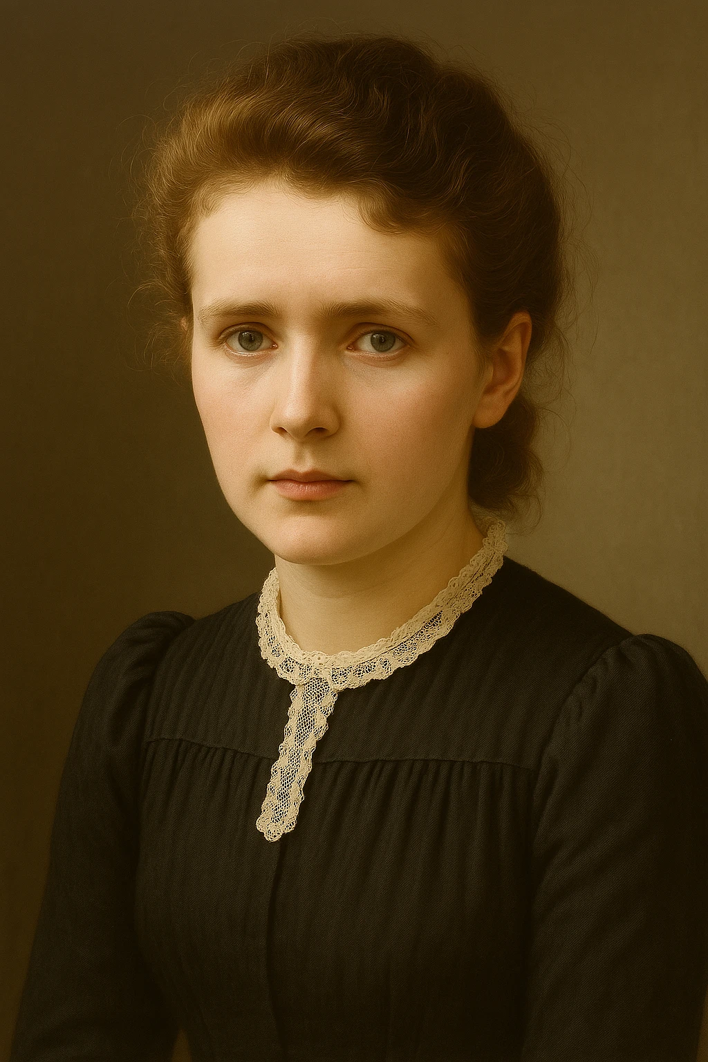 [Image Type: Ultra-realistic color photograph / Highly detailed realistic oil painting / High-resolution digital portrait] of a young Marie Curie. Facial Details: Face Shape: Oval-shaped, with slightly prominent cheekbones and a soft jawline. Skin Tone: Fair complexion with a subtle rosy undertone, showing natural skin texture and pores. The skin should appear very smooth and youthful, with minimal to no visible lines or wrinkles. Hair: Color: Light to medium brown, possibly with hints of auburn or golden tones. Style: Often styled in an updo, with soft curls or waves framing the face. The hair may be fuller and more voluminous than in older depictions. Eyes: Color: Light blue or blue-grey, with a bright and intelligent gaze. Shape: Almond to slightly round, with a youthful openness. Eyelashes and Eyebrows: Eyelashes are present but not heavily emphasized. Eyebrows are thin to medium, naturally arched, and light brown in color. Nose: Straight, medium-sized, and well-defined, with a slightly rounded tip. Mouth and Lips: Medium-full lips, natural rosy-pink color, often closed with a calm or slightly serious expression. Chin: Rounded and soft, proportionate to the face shape. Body and Clothing Details (if more than the face is included) : Body Build: Slender and youthful. Clothing: Often depicted in the fashion of the late 19th and early 20th centuries, such as: High-necked dresses or blouses, often with lace or decorative collars. Dark colors are common, but lighter tones may also be present. Background and Lighting: Background: Simple, often a plain neutral-colored wall or a softly blurred, indistinct background. Lighting: Soft, even lighting that highlights the youthful features. Overall Mood/Feeling: Intelligent, determined, and with a hint of youthful enthusiasm.