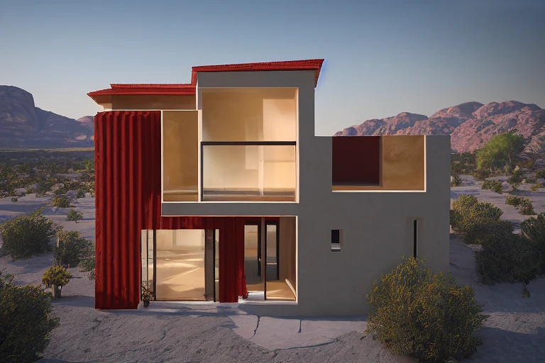 Ochre red small modern villa, cubic architecture, Ochre concrete, little windows, detailed, ultra-realistic, unreal engine, beautiful lighting, stunning desert environment, post-processing, 8k octane, de-noise, golden hour