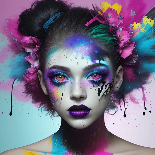 a close up of a woman's exploding abstract floral splattered paint pretty adorable face with bright makeup, inspired by David LaChapelle, misty neon lights, mert and marcus, editorial of dior magazine, peter guthrie --v 5. 1 --ar 3:4