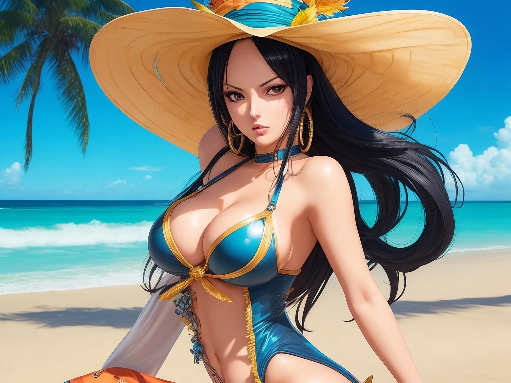Anime character from one piece , full body view of beautiful nico robin, sexy lingerie, detailed, sexy smile, , low front angle, full body view, vivid, standing on the beach, well-defined physiq, divine complexion, cinematic , high-definition, high-resolution, Unreal Engine 5, 8K resolution, incredibly highly detailed visuals, dark , beach background,