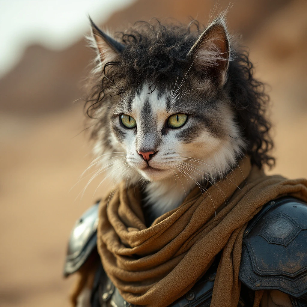 The Dune movie still shows an anthropomorphic cute Maine coon cat white and grey in the face as Paul Atreides in the desert with dark curly hair, wearing full armor with a scarf around neckon the planet DenisWait, full body, desert background, Sony A7 III with Canon RF 2470mm f/5 L IS USM lens, ultrawide, hyper detailed