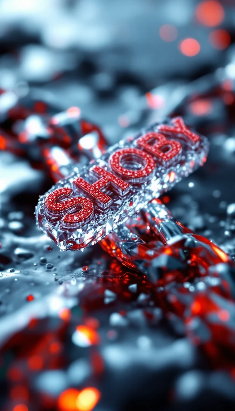 big diamond ice out cuba chain. On the Chain is the text: SHOBY" in a abstract red diamond font style. Focus on the chain. Ultra hd