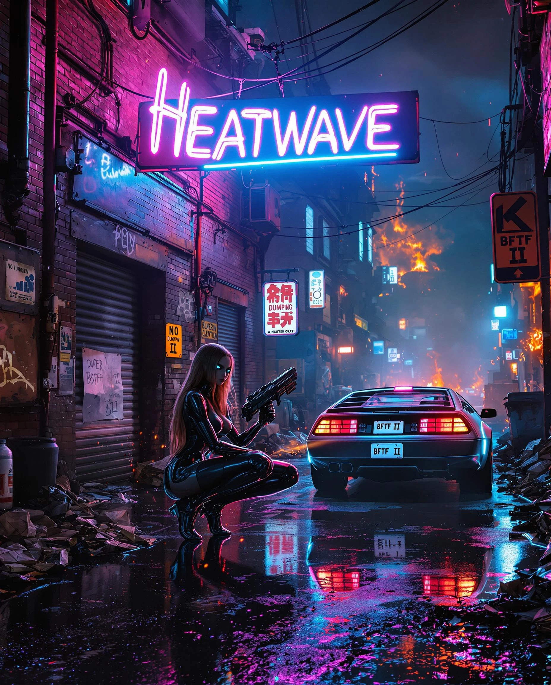 A hyperrealistic 8K cinematic masterpiece blending the gritty, neon-soaked aesthetic of a cyberpunk 1980s Tokyo alleyway with the intense action of a high-tech, futuristic battle. The scene unfolds in a dark, chaotic urban sprawl, alive with swirling fog and flickering neon lights that cast erratic, vivid glows of pink, blue, and fiery amber onto weathered brick walls and reflective puddles on the wet pavement. In the foreground, a stunning female android combatant crouches in the center of the action. Her sleek metallic body is meticulously designed with an anatomically accurate human form, featuring the correct number of limbs, joints, and fingers, each crafted with hyperrealistic precision. Her long, flowing hair, partially synthetic, appears alive as it dances in the subtle, ambient breeze. Her piercing blue glowing eyes exude a sense of unrelenting focus and power. She wields a futuristic laser gun, its barrel emitting a faint blue glow, and her stance conveys readiness and lethal precision, blending strength with elegance. The reflection of surrounding neon lights shimmers across her body, emphasizing the detailed craftsmanship of her design. At the top of the scene, a massive neon sign reading "HEATWAVE" is prominently displayed. The sign glows intensely in vibrant shades of pink and blue, its large, capitalized letters outlined in bright neon tubing. It is mounted on a weathered brick wall, flickering slightly to convey the wear of time. Sparks shoot intermittently from damaged sections of the sign, with one or two letters dimmed or slightly cracked for an authentic dystopian feel. The word "HEATWAVE" is unmistakable, drawing immediate attention as a centerpiece of the composition, its neon glow providing dramatic illumination to the entire scene. Next to the android, an iconic DeLorean car is parked at an angle, its gull-wing doors slightly ajar. The car’s polished silver exterior reflects the neon ambiance with exquisite clarity. The rear license plate is clearly visible, prominently displaying the text "BFTF II" in bold, futuristic black lettering against a white plate. The plate is framed by subtle metallic accents and surrounded by small scuffs and scratches, emphasizing its authenticity. This detail is carefully positioned in the foreground, ensuring it stands out and is easily readable within the scene's complex lighting. The alleyway is a gritty portrait of urban decay. Overflowing dumpsters with dented lids spill refuse across the ground, including torn garbage bags revealing rotting food, broken glass, and discarded electronic components. A shattered bottle lies next to a large puddle with an oily sheen that reflects distorted neon lights. The walls are covered in layers of graffiti and ripped posters advertising long-defunct products or events, their edges curling from years of exposure to the elements. A faded "NO DUMPING" sign hangs crookedly on one wall, partially obscured by fresh graffiti tags. Rusted trash cans and discarded, crumpled flyers litter the ground, adding to the dystopian atmosphere. In one corner, a rusty pipe leaks a small stream of water, forming another reflective puddle below. In the distance, smoldering wreckage and burning cars cast glowing embers into the smoky, fog-filled air, adding depth and tension to the composition. Volumetric lighting streams through the alley, casting dynamic beams of light that highlight the android’s intricate details, the neon sign above, and the DeLorean’s reflective surface. Every element—from the glowing “HEATWAVE” sign to the unmistakable “BFTF II” license plate and the surrounding gritty details—creates a visually immersive cyberpunk scene with vivid precision.
