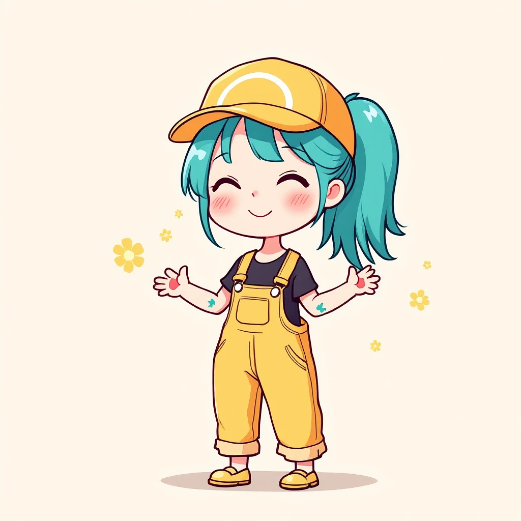 A stylized anime girl, with vibrant turquoise hair styled in a ponytail, wearing a yellow cap. She's dressed in yellow overalls, a black crop top, and matching footwear. Her expression is cheerful and playful, with a slight smile. Her hands are positioned in a graceful pose, and she has light teal-colored fingernails. Simple, stylized light teal markings are on her arms. Soft, light yellow flowers are scattered in the background. The overall color palette is bright and cheerful, with a light beige backdrop. The art style is simple yet detailed, exhibiting a childlike quality. Character design emphasizes dynamism and a touch of playful energy. Digital painting style, cute and vibrant, cartoonish anime art style, flat colors, 8k resolution, --ar 1:1. 5