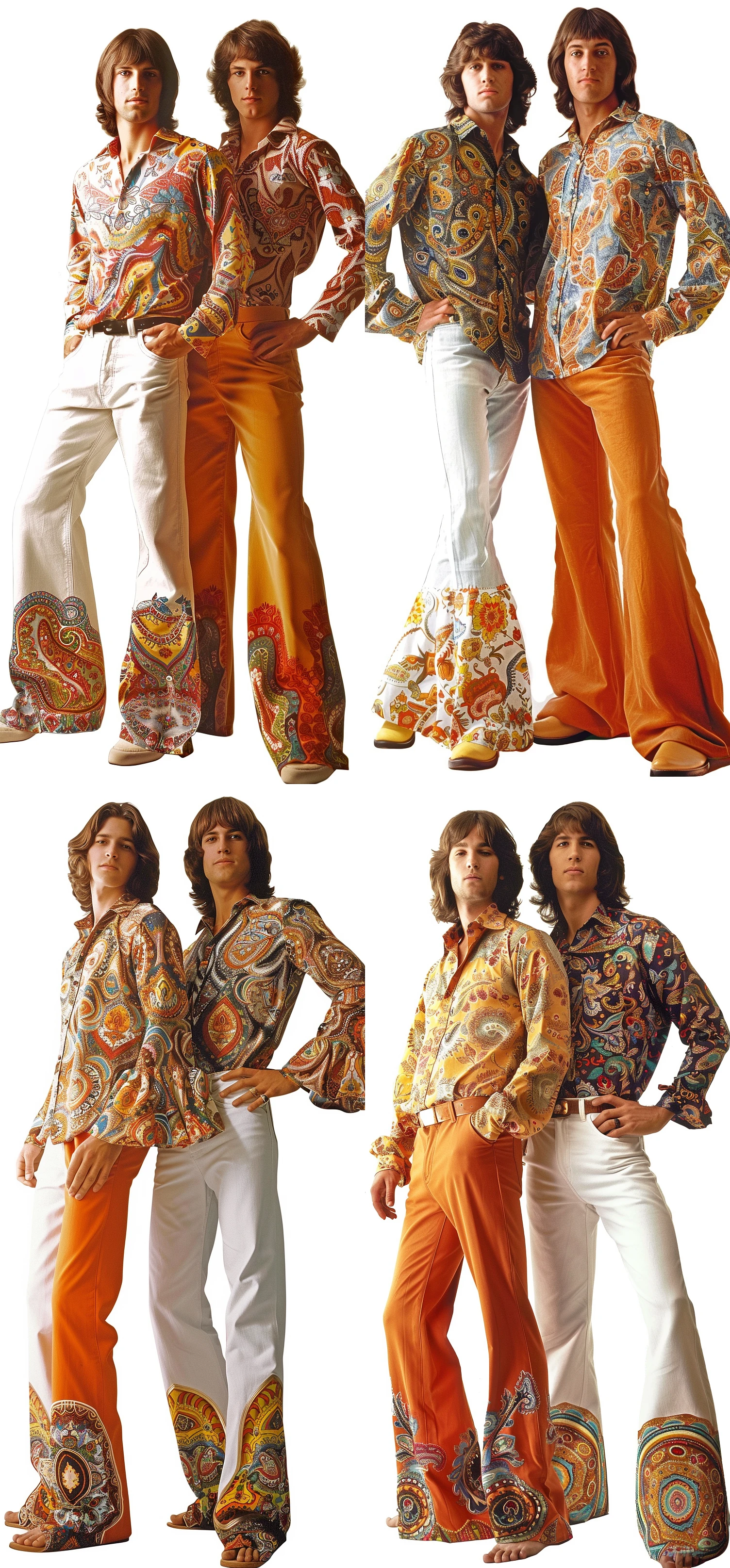 Two men in bellbottom jeans and paisley shirts against a white background, in the style of 70s magazine. --ar 43:93 --v 6. 0