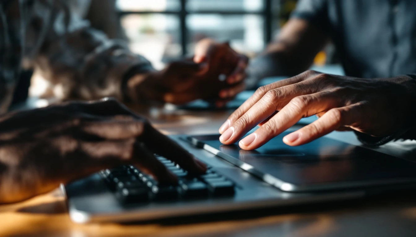 `/imagine prompt: Tech startup team presenting new app, focus on hands: African American developer's hands (visible knuckle wrinkles, short trimmed nails) typing on mechanical keyboard, East Asian designer's hands (smooth dorsal surface, single age spot) gesturing at holographic interface, Caucasian CEO's hands (visible tendon movement) holding prototype device, modern office with floor-to-ceiling windows, sunlight minimizing skin texture noise --hand_anatomy v3 --no alien_skin, claw_fingers --detail_boost 4`