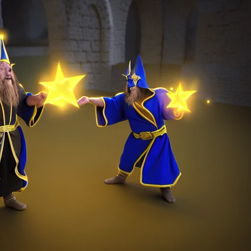 Two muscular wizards with wizard hats on and long blue robes with yellow stars on them in a fight using magic powers, masters, ultra realistic, 36k, 3D, volumetric lighting, manure rendering