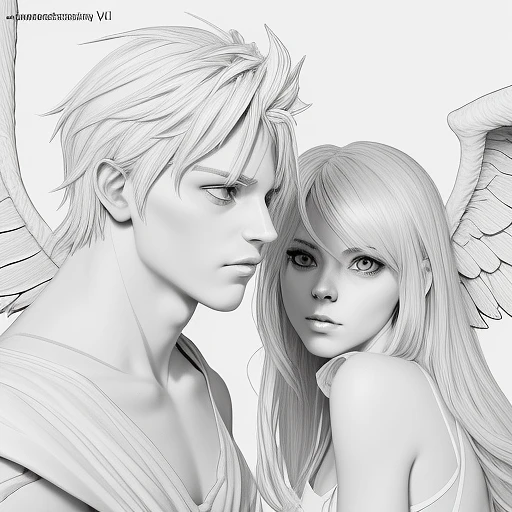 /imagine prompt: Male Demon staring at female angel, I'm the style of a coloring page, realstic shading, clean line art, black and white:: cartoon::1 realistic::1 accent lighting::1 --ar 1:1 --v 4