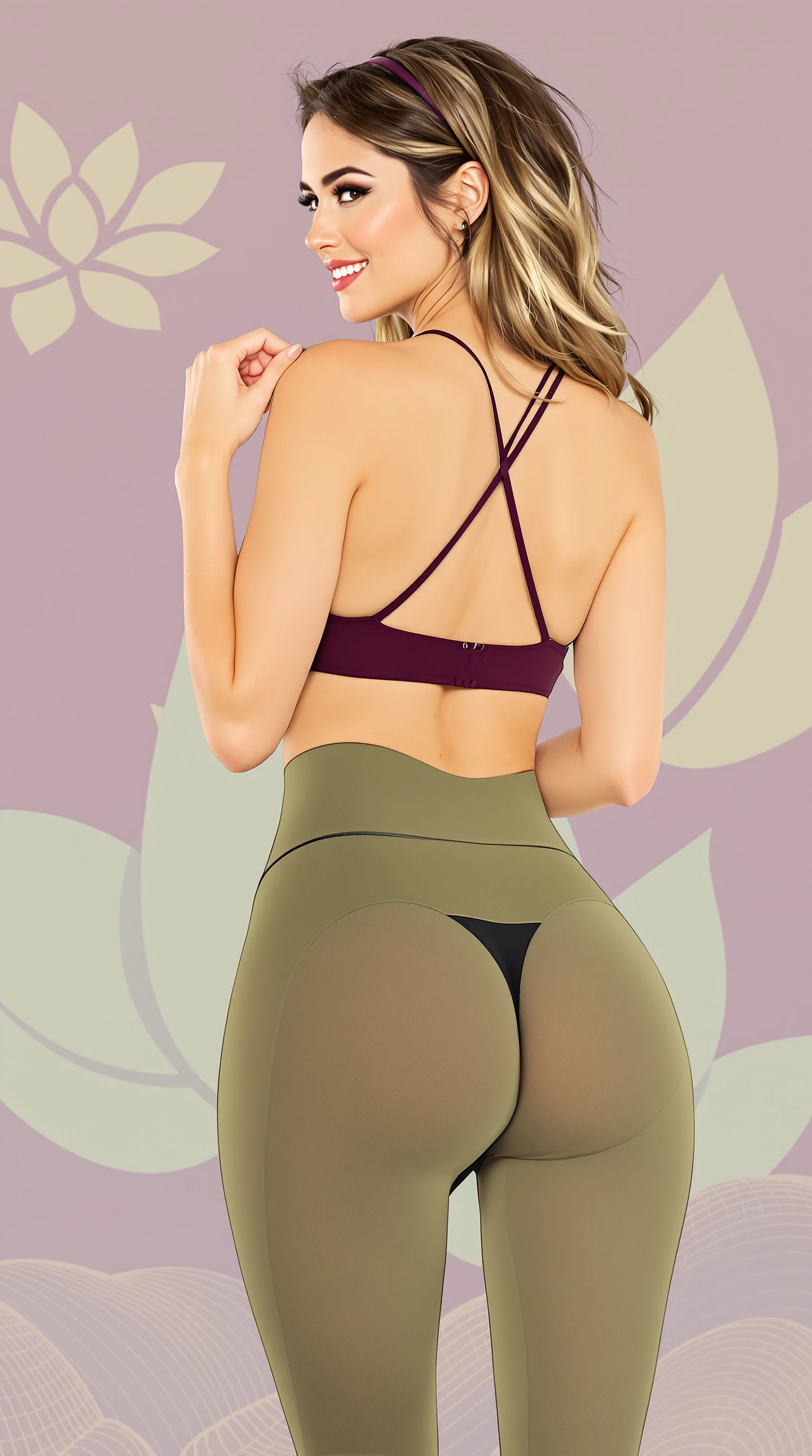 in the style of chargen_stylised_illustration image of a woman with her back to the viewer, head turned over her shoulder, wearing a deep purple yoga bra with thin straps and a keyhole cutout at the chest, paired with high-waisted, olive-green yoga leggings with a sheer mesh panel at the hips, revealing a black thong underneath. One hand tugs at a strap playfully. Hair styled in long, loose waves with a thin headband, evoking a serene yet seductive yoga vibe. Background: muted purple and green gradient with abstract lotus flower shapes, suggesting a yoga studio.