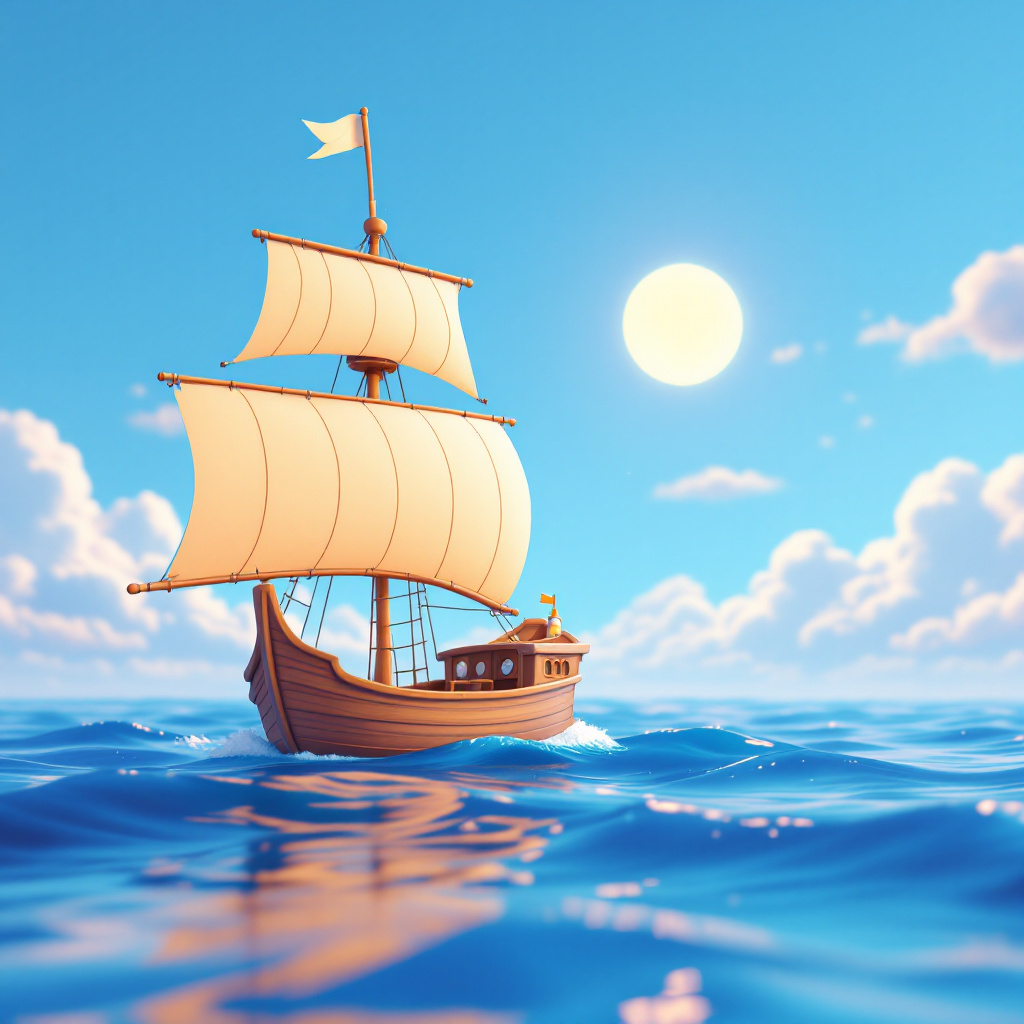 Children's cartoon, a wooden merchant ship sails on the waves of the ocean. Its sails are fluttering in the wind. Background: blue water, sun is shining, calm sea, calm. Pixar, Disney, concept art, digital 3d art, Maya 3D, ZBrush Central 3D shading, bright coloured background, cinematic, reimagined with industrial light and magic, post processing in 4k resolution ’