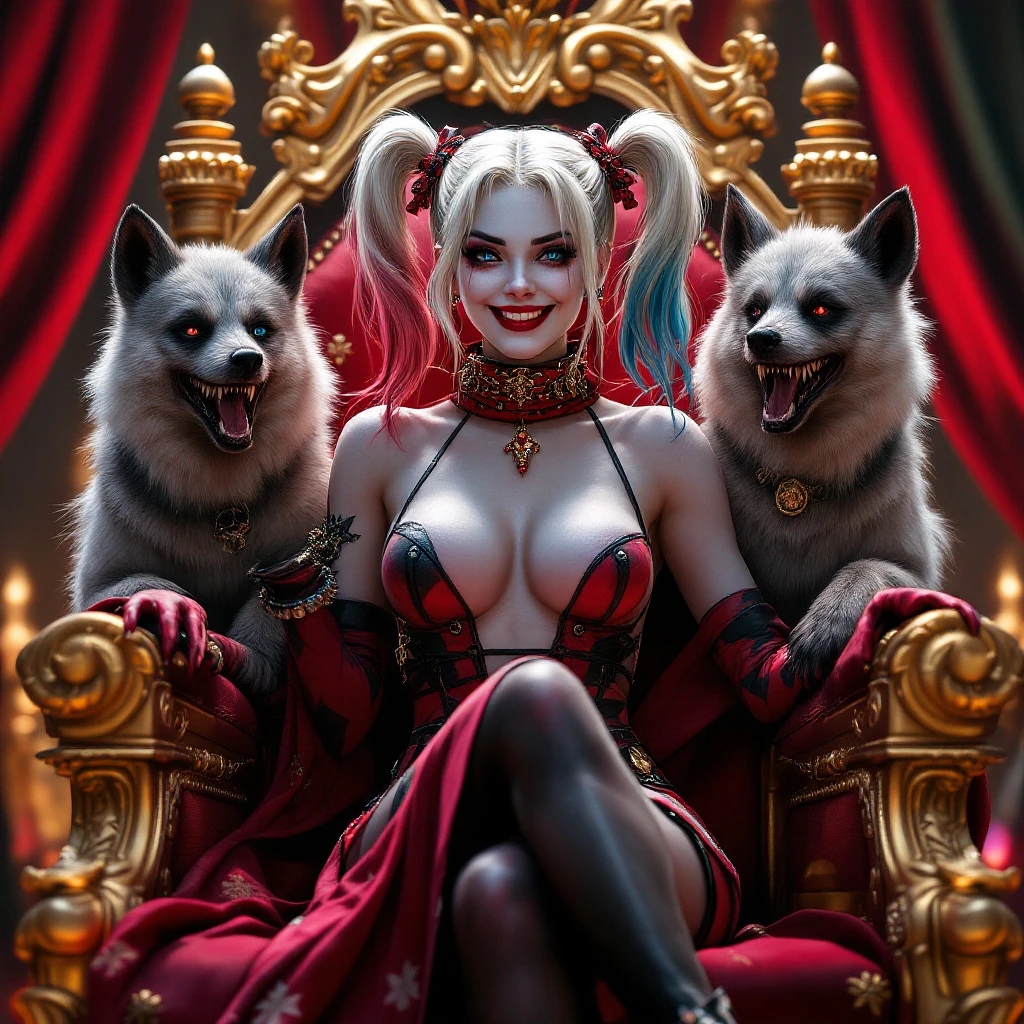 A Full Body photo shot of new Harley Quinn, sitting on her throne chair, smile (happy) , beauty, playful pose, waving, next to her is her two majestic hyenas guarding her, playful, red and white scarf, beautiful face, vivid colors, elegant, concept art, sharp focus, digital art, Hyper-realistic, 8K resolution, Unreal Engine 5, Highly Detailed, HD, Dramatic Lighting by Brom, trending on Artstation, hyperdetailed eyes, hyperrealism extremely detailed epic masterwork ((masterpiece) ), Hyperrealistic, splash art, concept art, mid shot, intricately detailed, color depth, dramatic, 2/3 face angle, side light, colorful background, Luxury, royalty curtains, golden accents