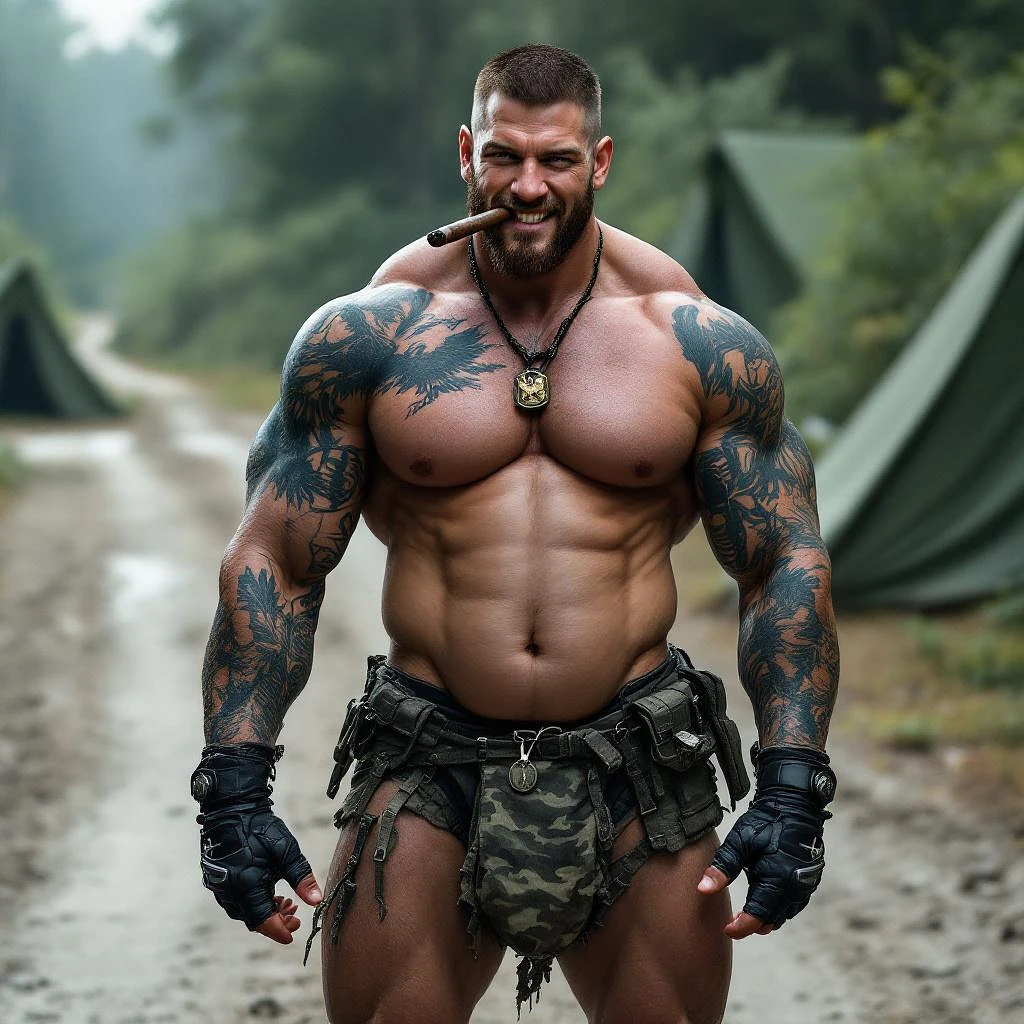 Chris Redfield, Full body image, looking at us, shirtless, muscular abs, lots of tattoos, eagle chest tattoo, dog tags, big cigar in mouth, black fingerless gloves, camouflage thong underwear with huge long semi erect penis bulge, big feet in black combat boots, standing on dirt road with army green tents, flexing one bicep, grinning