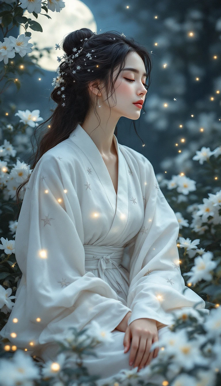 4. A serene, three-quarter portrait of a woman sitting in a tranquil, moonlit garden surrounded by flowering jasmine and glowing fireflies. She wears a flowing, white linen robe with embroidered silver stars, and her hair is a dark, voluminous cloud interwoven with delicate silver threads. Her eyes are closed in peaceful contemplation, and the scene is imbued with a sense of calm and spiritual transcendence. The aesthetic combines the serene beauty of Chinese ink wash painting with the ethereal lighting of pre-Raphaelite art.