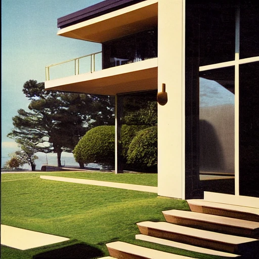 hyper realistic eye level exterior photo of a mid century modern style house overlooking the ocean, daylight, indirect lighting, AD magazine, Frank Lloyd, Eames, Mies van der Rohe