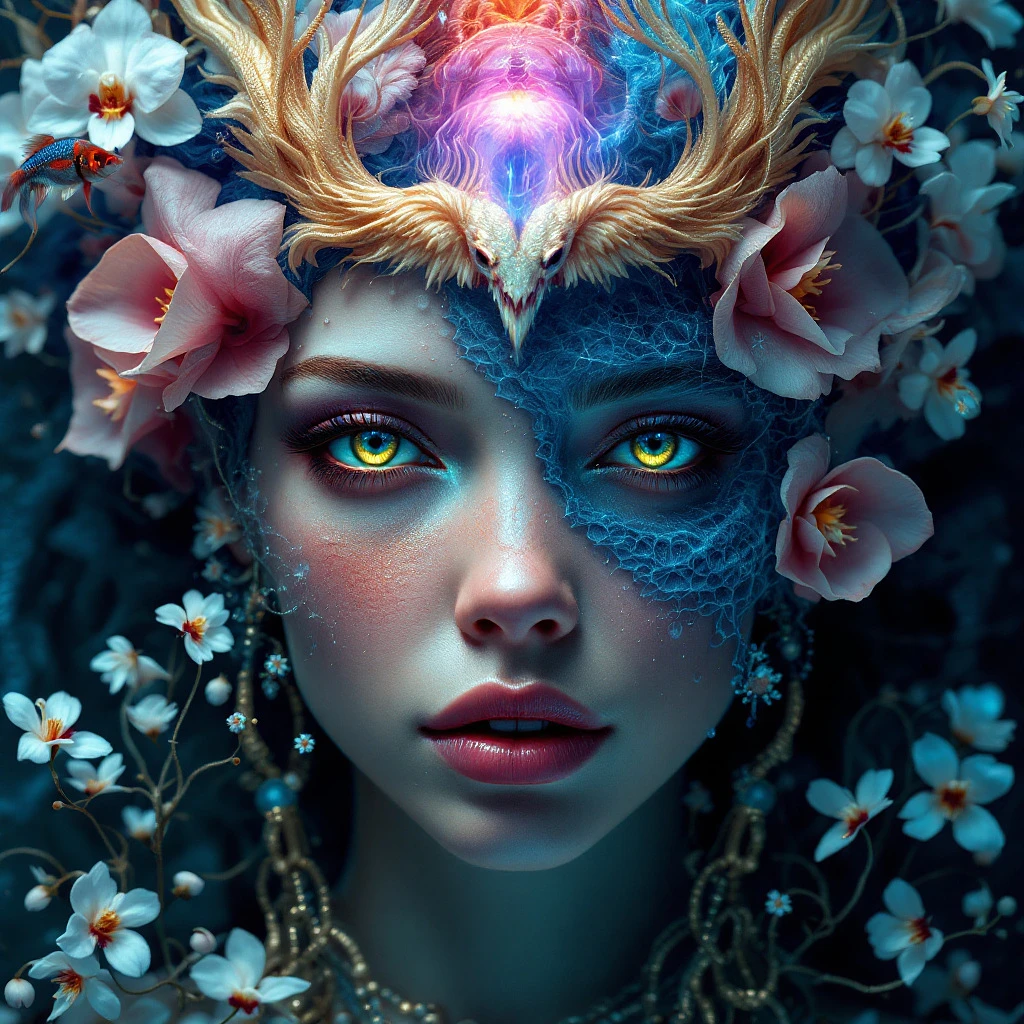 Goddess close-up portrait ribcagel. jellyfish phoenix head, nautilus, orchid, skull, betta fish, bioluminiscent creatures, intricate artwork . octane render, trending on artstation, t symmetrical artwork. cinematic, hyper realism, high detail, octane render, 8k