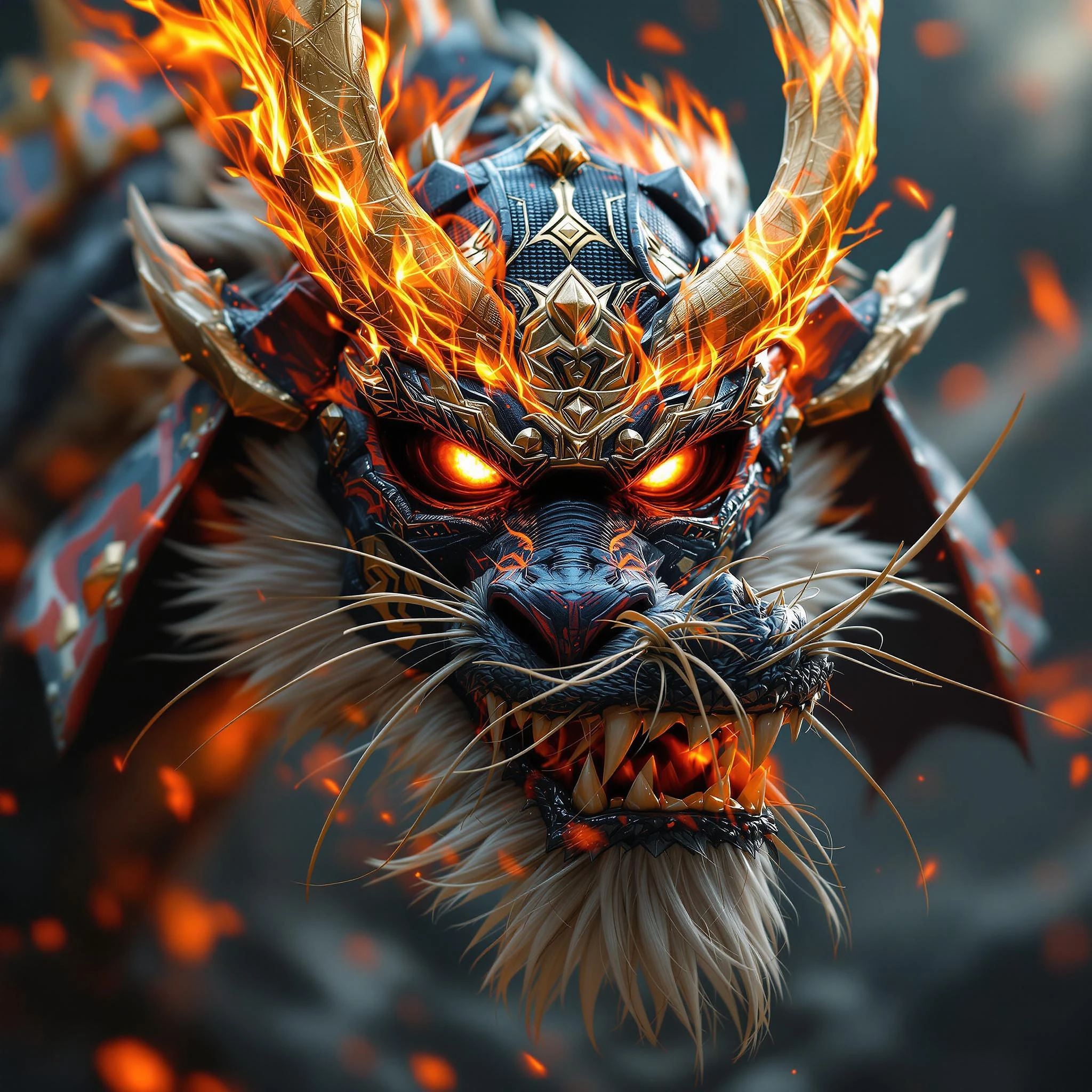samurai dragon, fiery eyes, tiger coloured helmet, close angle, 8k ultra realistic, photography lighting, ultra detailed, photorealistic