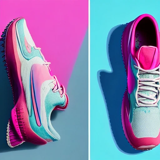 The pink and blue color palette running shoes are designed by Kanye West and Jacques Muss, with Nike logo printed on the side of the shoes, elegant and luxurious, with a fluffy blue cloud shape in the background, volume lighting, octane rendering, product lens, 8K, high details, complex details - s 750- q 2