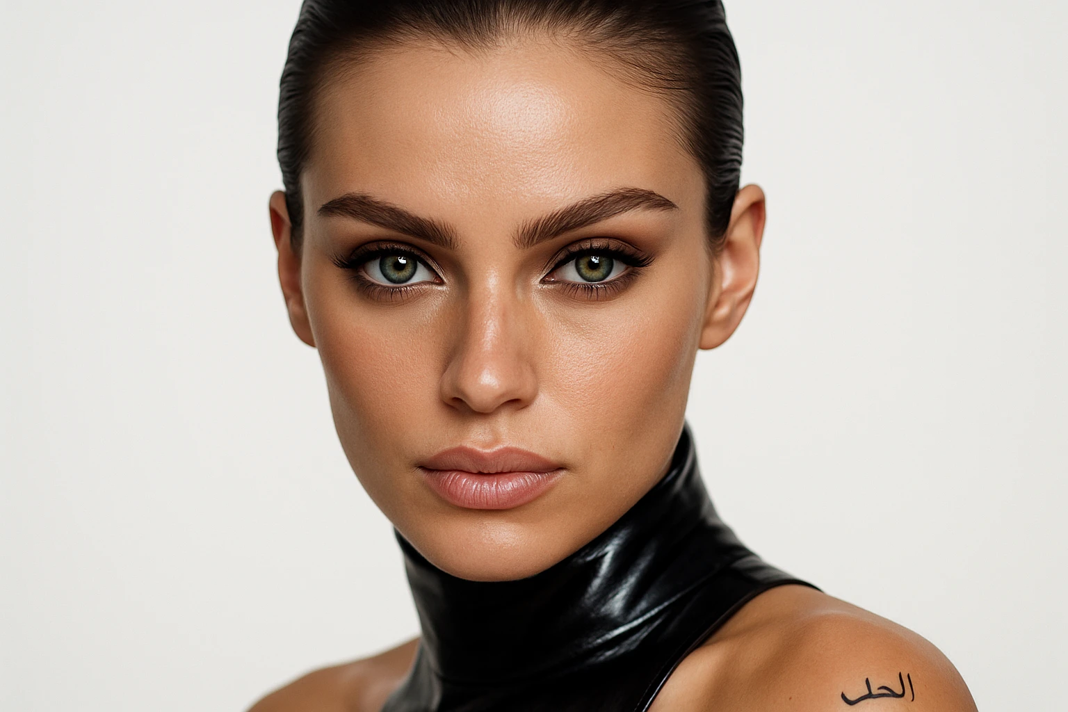 A hyper-realistic close-up portrait of a woman with striking green eyes, perfectly sculpted cheekbones, and smooth, flawless skin. Her hair is slicked back tightly, revealing her symmetrical face and strong jawline. She has subtle, natural makeup with defined eyebrows, smoky eyeshadow, long voluminous eyelashes, and nude matte lips. The lighting is soft and even, highlighting the natural texture of her skin and subtle freckles across her nose and cheeks. She wears a sleek black latex or leather high-neck garment that wraps elegantly around her shoulder. A delicate, small Arabic script tattoo is visible on her shoulder. The background is clean and minimal, pure white, ensuring all focus remains on her captivating features. Ultra-detailed, photorealistic skin pores, natural shine on the lips, and realistic reflections in the eyes. Studio lighting, high resolution, sharp focus.