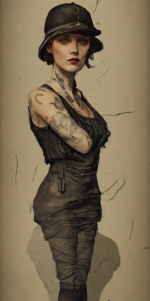 Concept art of a beautiful female industrial 1900s gangster, Sam Weber, Joao Ruas, Octavi Arrizabalaga portrait Peaky Blinders aesthetic canon of proportion grunge and vintage and sci fi aesthetic::1, epic lighting, hyperdetailed, artstation, 8k, high resolution, burnt edges, golden ratio, analogous colors, minimalist::1 --uplight --no long neck --no long anatomy --no extra anatomy --no second face —ar 9:16