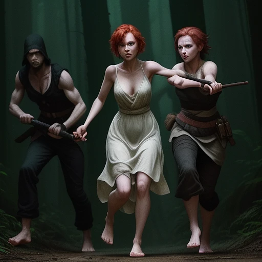{ "prompt": "In the middle of a dense, shadowy forest, a young woman with fair skin, short red hair, and striking green eyes is being attacked by two bandits. The woman is barefoot, wearing a simple white dress that contrasts with the dark surroundings. She appears frightened, trying to defend herself as the two menacing bandits, both dressed in ragged clothing, approach her with knives drawn. The atmosphere is tense, with the dim light filtering through the trees casting eerie shadows, heightening the sense of danger and urgency in the scene. ", "size": "1024x1024" }