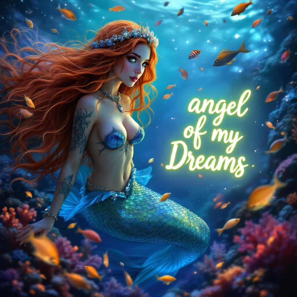A graceful mermaid with long, flowing, ginger hair with blonde and dark blue stripes false lashes, vibrant, tattoos piercings light, freckles, silver Kimmy necklace hair, often flowing with the currents, and a shimmering, iridescent tail in shades of blue and green. Her eyes are bright, emerald green and her expression is serene and mystical. She wears ornate seashell jewelry and a delicate crown crafted from pearls and coral. She swims through a vibrant coral reef, illuminated by shimmering, glowing crystals that illuminate the ocean floor, where colorful fish and other sea creatures dart around her. The lighting is soft and magical, reflecting off the water. The atmosphere is enchanting, beautiful, and full of aquatic wonder a sign that glows in white saying in the background angel of my dreams