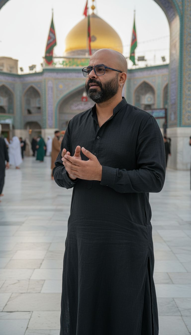 Generate a hyper-realistic portrait of a stylish young man with a lean physique (around 57 kg, 5'6" tall) — his beard remains unchanged, and his head is clean-shaven, giving him a modern, confident bald look. He is wearing one small, silver hoop earrings in both ears, adding a subtle, stylish edge to his appearance. Muslim man using the uploaded reference photo. The man is standing at Karbala, Iraq, in front of the shrine, his gesture of devotion. He is wearing a full black linen pathani kurta with realistic folds.