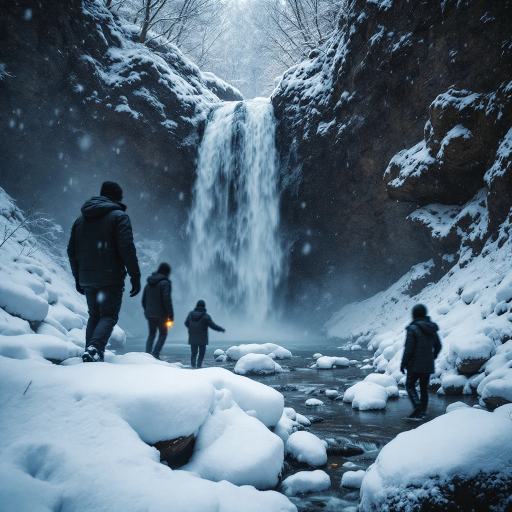 Heavy snow, photo style, waterfall at the source of the hot spring, dark night, three blurred figures