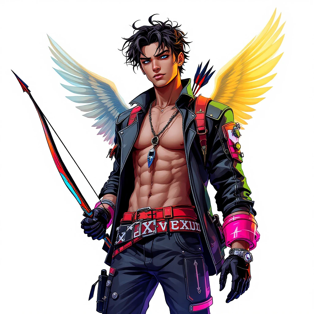mixed race anime boy cupid in dressy street wear with a cyber punk bow and arrow white background full body