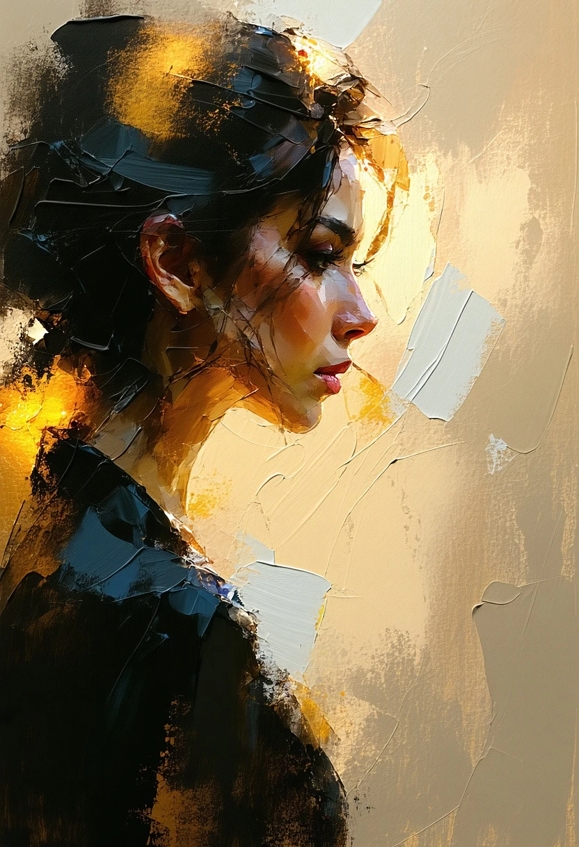 a painting of a woman, in the style of brushstroke-intensive portraits, cinematic elegance, golden light, flowing brushwork, multilayered realism, feminine themes --chaos 75 --ar 1:2 --profile rsy6uq9 --stylize 750