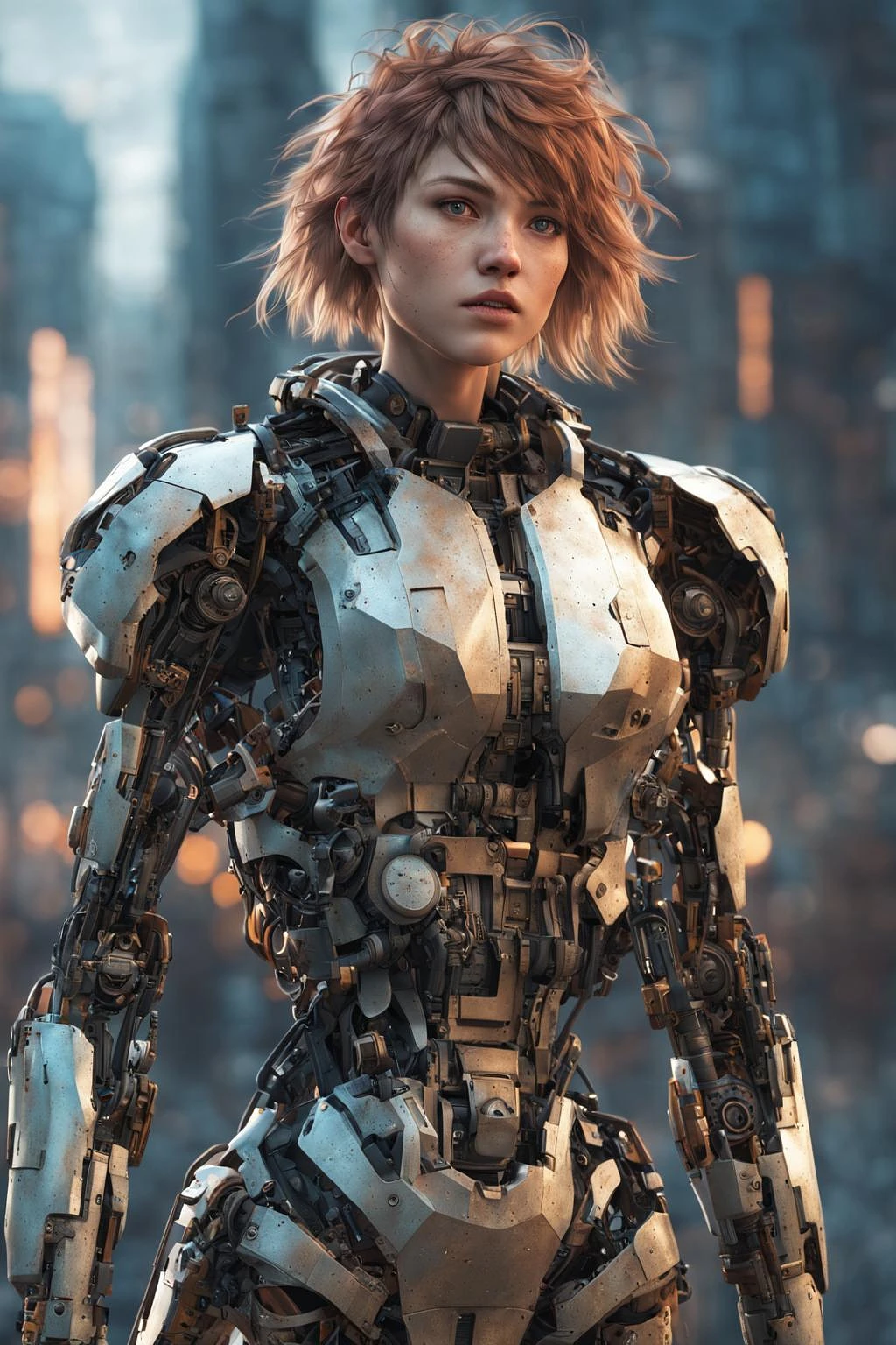 full body, a beautiful cyborg girl with dirty and damaged body, rusty metal arms, rusty brown body, perfect human head, perfect round young looking face, short messy hairs, highly detailed body, cyberpunk, character design, solid background, dusk, hyper realism, photorealistic, octane render, 3d render, raw color image