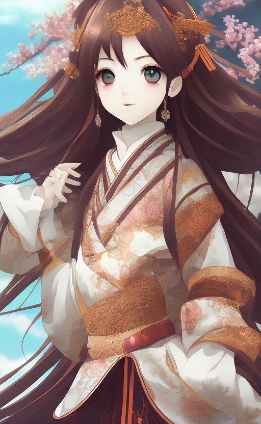 a beautiful female in japanese clothings| standing on a hill | centered| detailed gorgeous face| anime style| key visual| intricate detail| highly detailed| breathtaking| panoramic| cinematic| wataboku |