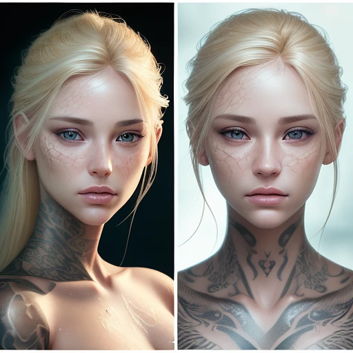 photo portrait of a beautiful blonde female water on left side and fire on right side of face, photography, detailed skin, realistic, photo-realistic, highly detailed, full length body shot expressive facial features, tattoos, High detail RAW color art, piercing, diffused soft lighting, shallow depth of field, sharp focus, hyperrealism, cinematic lighting --ar 9:21 --quality 2 --s 750 --v 5. 1