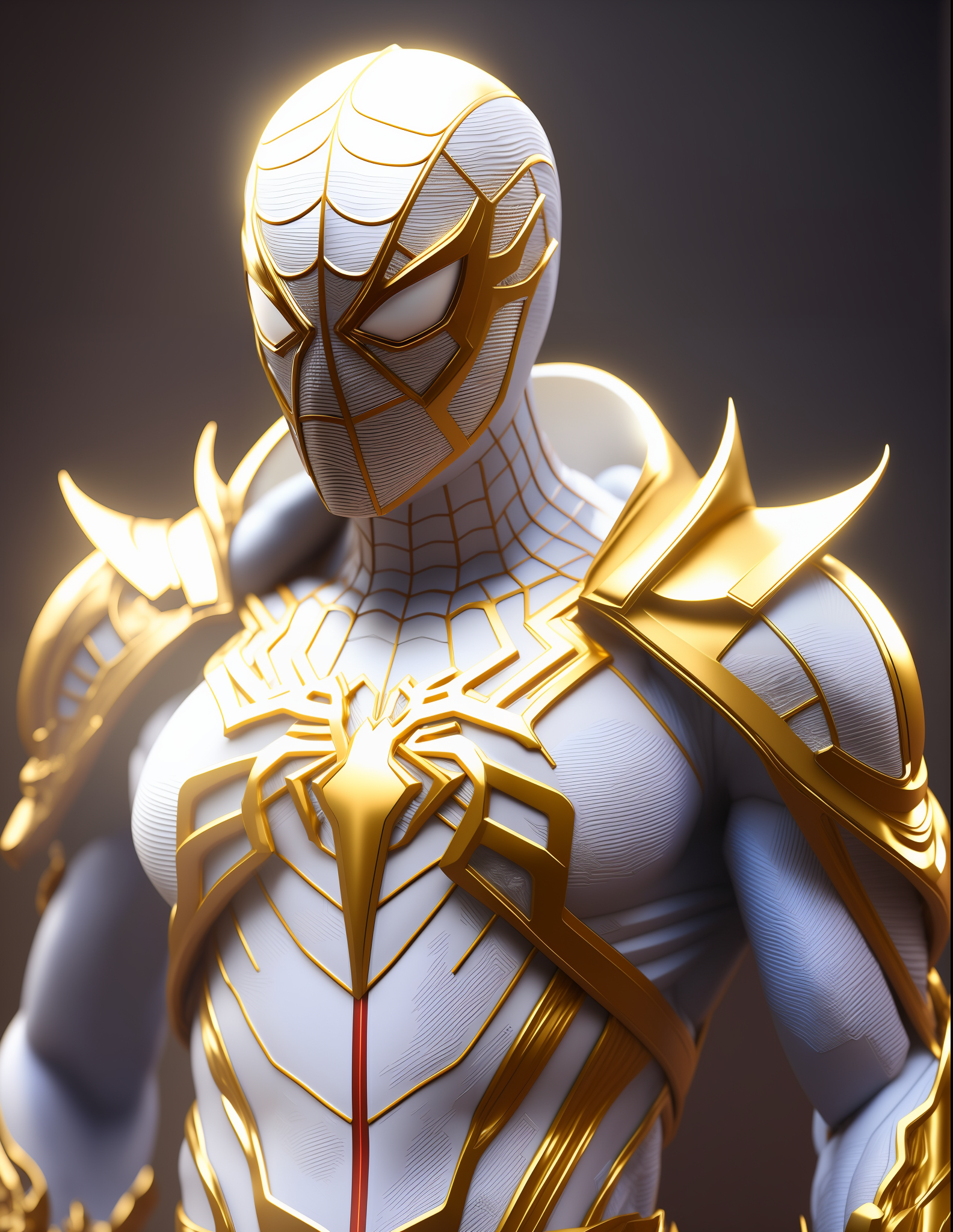 a close up of a statue of a man with a gold and white costume, super detailed render, 3 d render character art 8 k, intricate white and gold armor, full samurai armor spiderman, high detail iconic character, 8k render”, octane render ”, octane render”, super detailed octane render, super rendered in octane render, hyper detailed 3 d render, futuristic style spiderman
