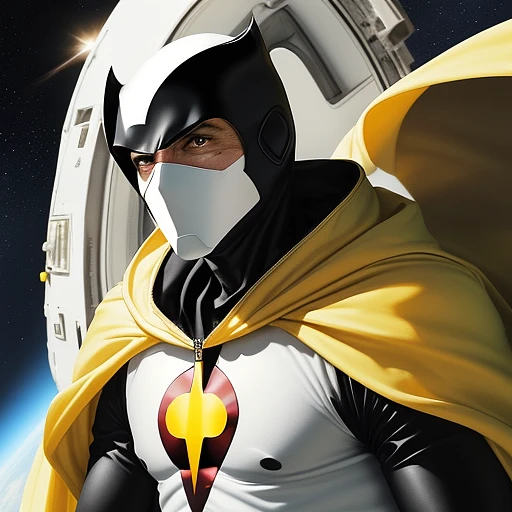 george clooney in a white bodysuit with a wispy yellow cape, black mask connecting to his red and black emblem, power bands, and a power belt. Like many superheroes of the era, he has no visible pupils and is flying in space.
