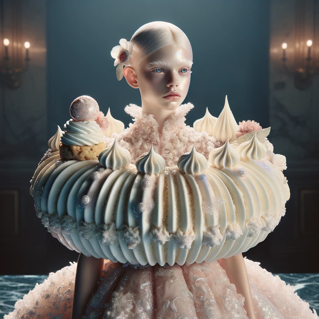 Fashion Photography: A hyper-realistic, surreal portrait channeling the Gucci aesthetic. A young girl with luminous, fairy-like skin stands majestically. She is adorned in an expansive dress, reminiscent of a delectable meringue cake, with fluffy layers and a sugary sheen. This avant-garde creation, designed by a renowned designer, is both a fashion statement and a nod to the world of pastry. The ambiance is luxurious, with the girl's ethereal beauty and her unique dress being the undoubted focal points of this high-resolution image.
