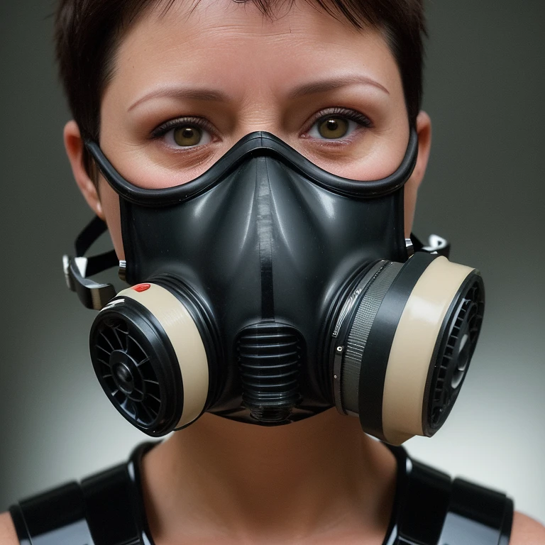hyper realistic headshot photo of a 40 year old woman, wearing a latex gas mask, short hair, Extreme Close-Ups, Full Frame camera, ISO: 100, Aperture (f-stop) : f/1. 8, Shutter Speed: 1/30, Camera Lens: 85mm prime lens, Camera Eye Line: Low, Studio Lightning